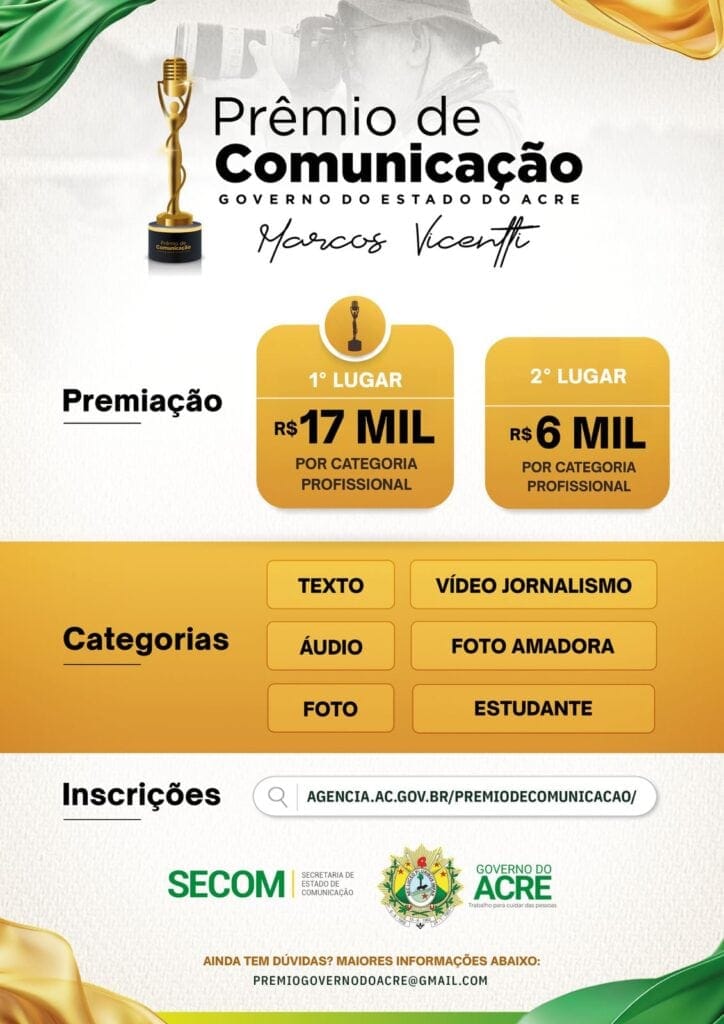 Durante o evento, que reunirá jornalistas, autoridades e convidados, serão anunciadas as melhores produções avaliadas pela comissão julgadora. Promovido pelo governo do Acre, por meio da Secretaria de Estado de Comunicação (Secom), o prêmio busca estimular e valorizar a produção de trabalhos jornalísticos para destacar as melhores notícias veiculadas em diferentes veículos ou plataformas, com conteúdos que contribuam para o cumprimento do dever constitucional de dar publicidade aos atos e ações de governo em áreas como saúde, segurança pública, educação e meio ambiente, entre outros que sejam de interesse e relevância para a sociedade acreana.